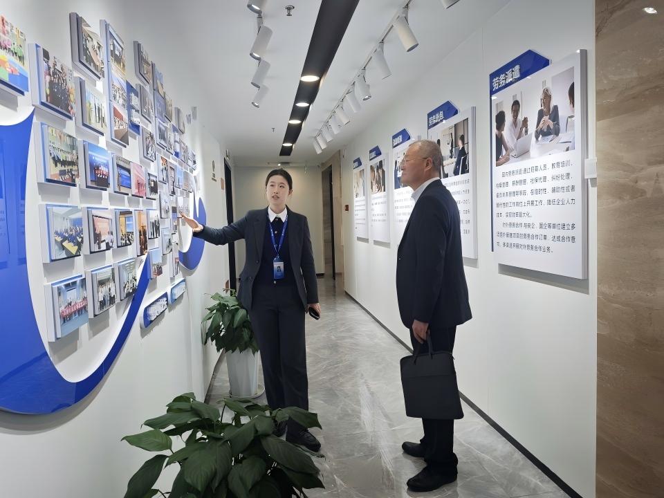 在学校领导的参观过程中,企业负责人陪同其考察了办公环境及数字化人才服务展示区。通过观摩与交流,学校领导深入了解了企业的发展历程、业务布局以及行业趋势。企业重点展示了人力资源数字化领域的创新产品与服务模式,呈现了科技赋能下人才招聘、职业规划、用工解决方案的智能化水平。学校领导详细询问了企业对人才专业技能、职业素养、实践能力的核心要求,为优化人才培养方案、调整学科结构提供了重要参考。