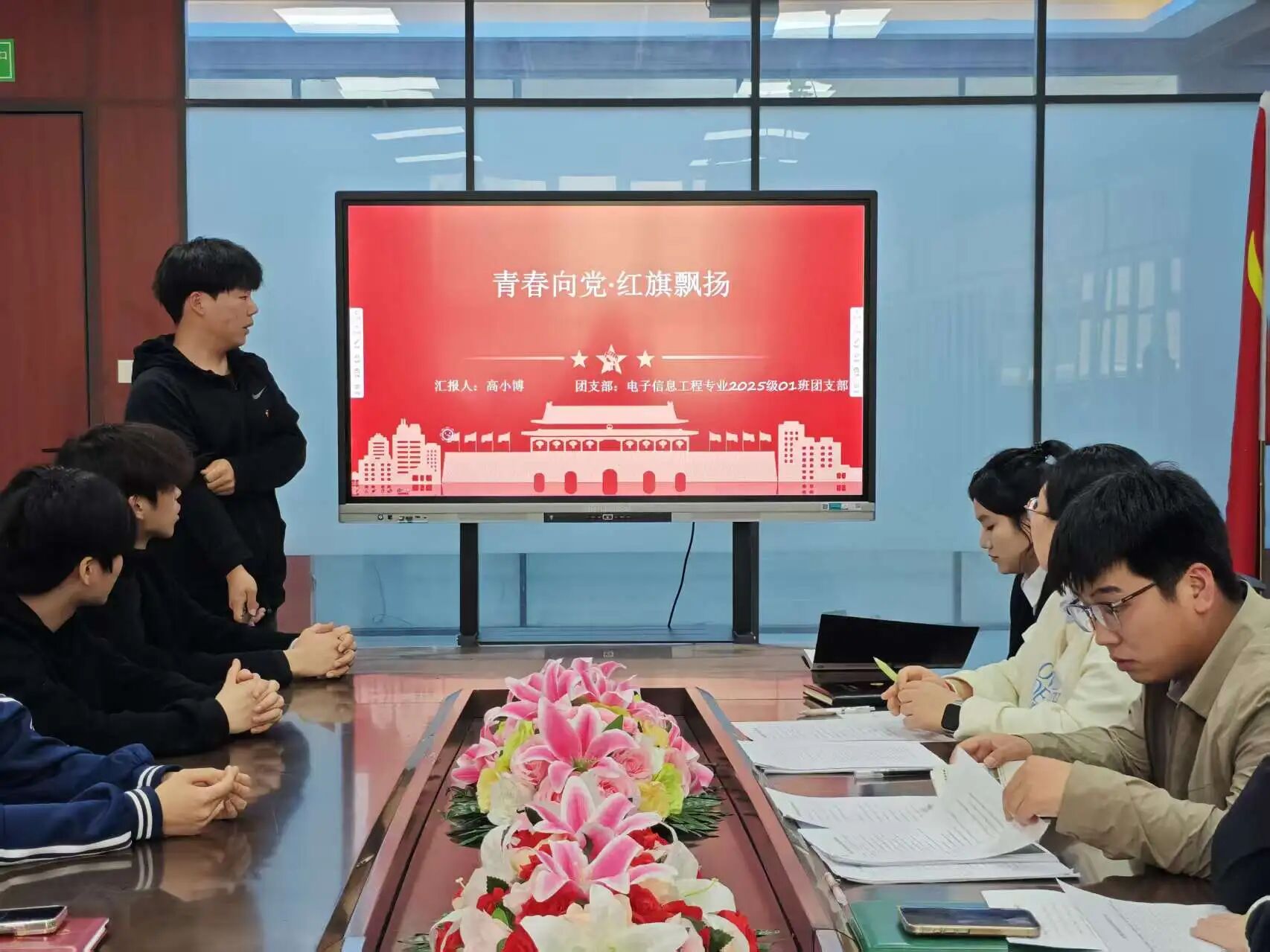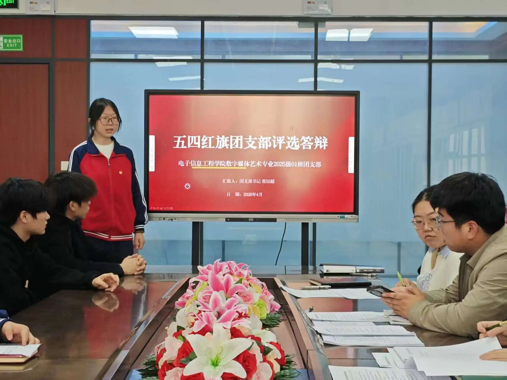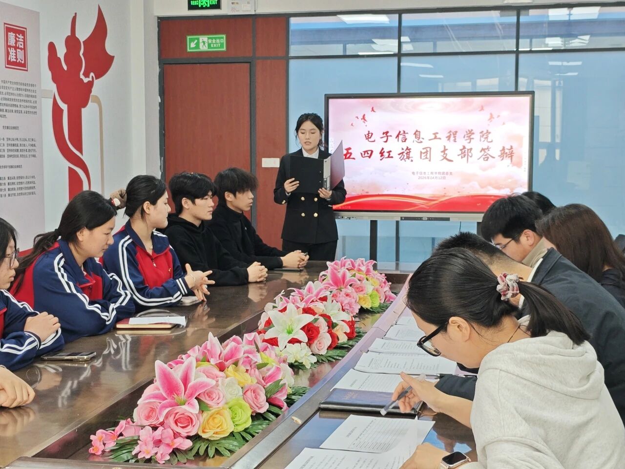 为深入学习贯彻党的二十大及二十届历次全会精神,全面落实习近平总书记关于青年工作的重要思想,进一步夯实基层团支部建设、选树先进典型、激发团组织活力,2026年4月13日,电子信息工程学院团总支顺利举办五四红旗团支部答辩评审会。学院党委副书记、学管副院长刘帆,团总支书记师光泽及辅导员代表担任本次答辩评委,本次答辩会由组织部俞子淇同学主持,各参评团支部书记依次登台汇报展示。