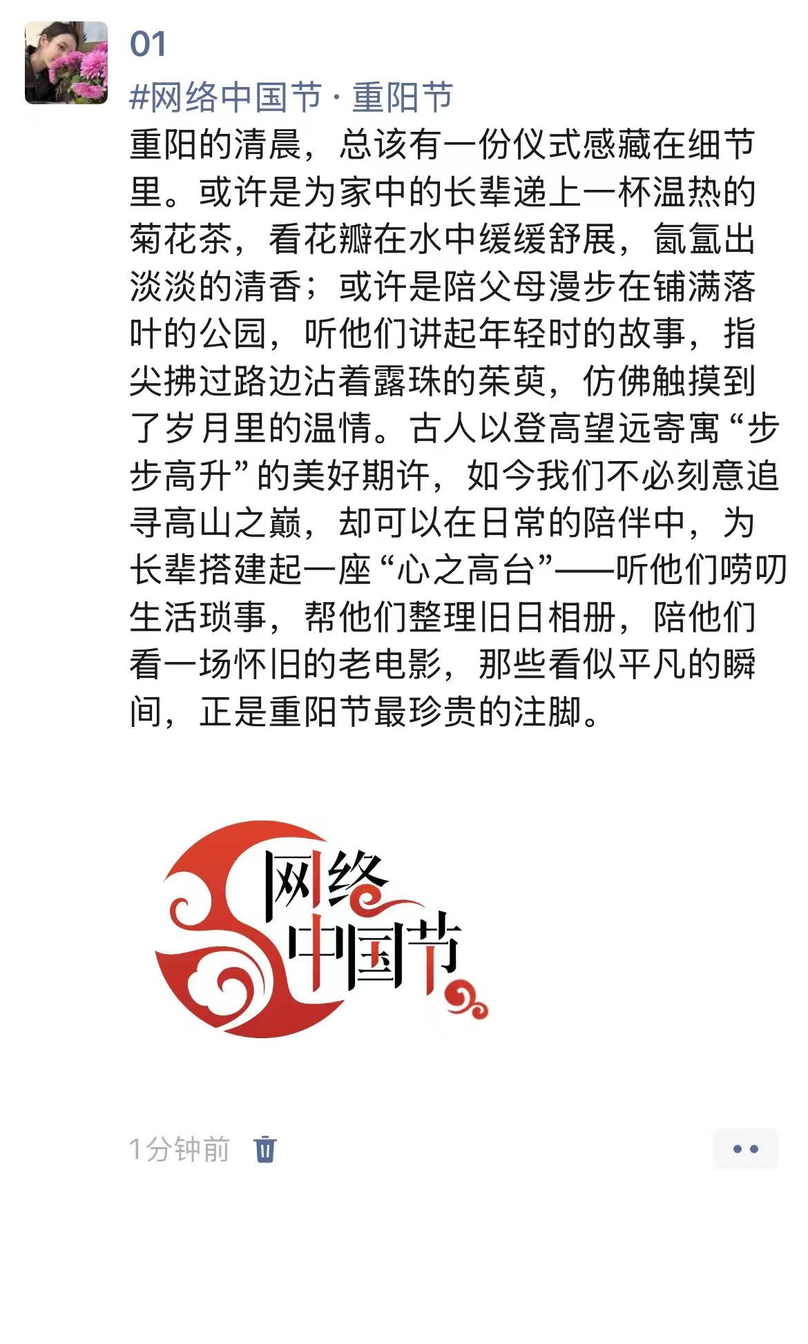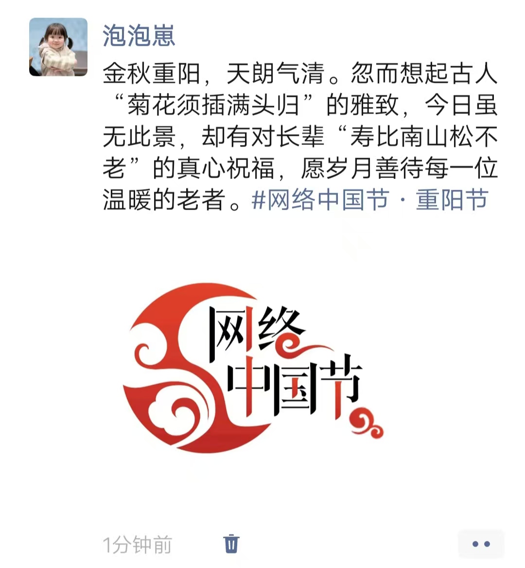 此次重阳节主题宣传活动,以“云端”形式打破时空限制,让支部同志们在指尖互动中感受传统节日的魅力,在分享交流中强化文化传承意识。未来,教育学院第三党支部将继续以“网络中国节”为契机创新形式、丰富载体,推动传统文化融入日常,引导支部同志们坚定文化自信、践行传统美德。