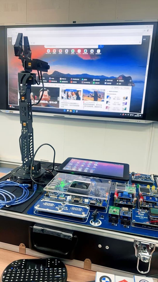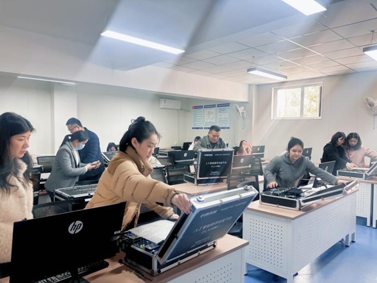 培训现场,来自西安京天网络科技有限公司的技术老师围绕人工智能教育实训平台展开深度拆解与实操演示。从高精度机械臂的姿态控制、视觉识别模块的目标抓取,到语音交互、RFID识别、嵌入式开发等核心功能的部署与调试,技术老师结合具体教学案例逐一拆解操作逻辑,细致讲解设备连接、程序部署、数据采集与故障排查等关键环节。参训教师们分组动手实践,在机械臂精准抓取、智能交互场景模拟等任务中反复练习,主动交流探讨实操难点,现场形成了“边学边练、边练边悟”的浓厚学习氛围,切实掌握了人工智能设备的日常运维与教学应用方法。