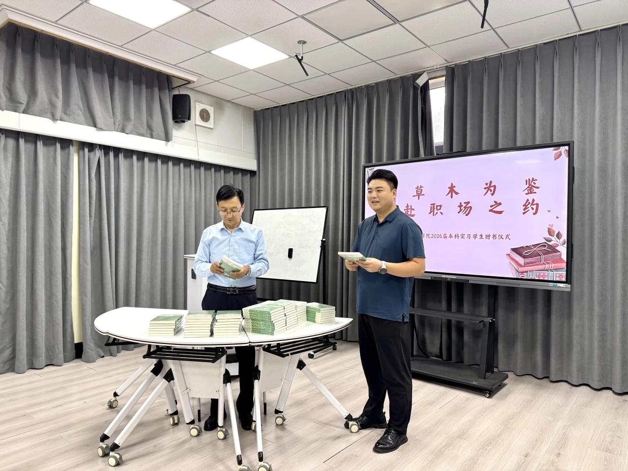 仪式现场,张永明院长亲手将一本本饱含期许的《草木为师》递到学生手中,封面的绿意与学子们眼中的憧憬相映成趣。在随后的讲话中,张院长以“草木”为喻,深情寄语在场学子:“思源校园的一草一木,都是大家四年青春的见证者——春芽破土的坚韧,夏木成荫的担当,秋叶沉淀的智慧,冬枝蓄力的沉稳,恰如人生不同阶段的修行。”他勉励同学们,实习是从校园到社会的“过渡站”,也是将知识转化为实践的“练兵场”,希望大家以《草木为师》为指引,在书中感悟自然蕴含的生存哲学与成长智慧,面对职场挑战时能如草木般扎根向下、向阳生长。