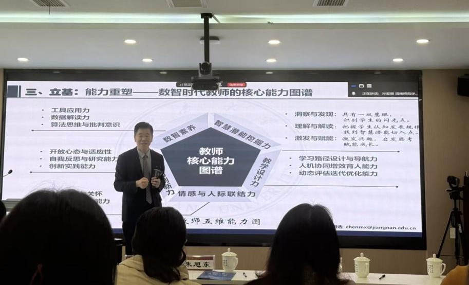 本次论坛设置主会场与分会场,分上下午两个阶段有序开展。上午的主会场报告环节,五位国内知名教育专家先后登台,带来了一场场高屋建瓴、内容详实的学术盛宴。江南大学陈明选教授,他以《从知识传递者到智慧引路人:数智时代教师的角色升维与能力重塑》为题,深刻剖析了数智时代对教师角色带来的冲击与变革。陈教授指出,传统 “知识传递者”的角色已难以适应新时代教育需求,教师需向“智慧引路人”转型,并系统构建了数智时代教师的核心能力图谱,为教师专业发展指明了方向。
