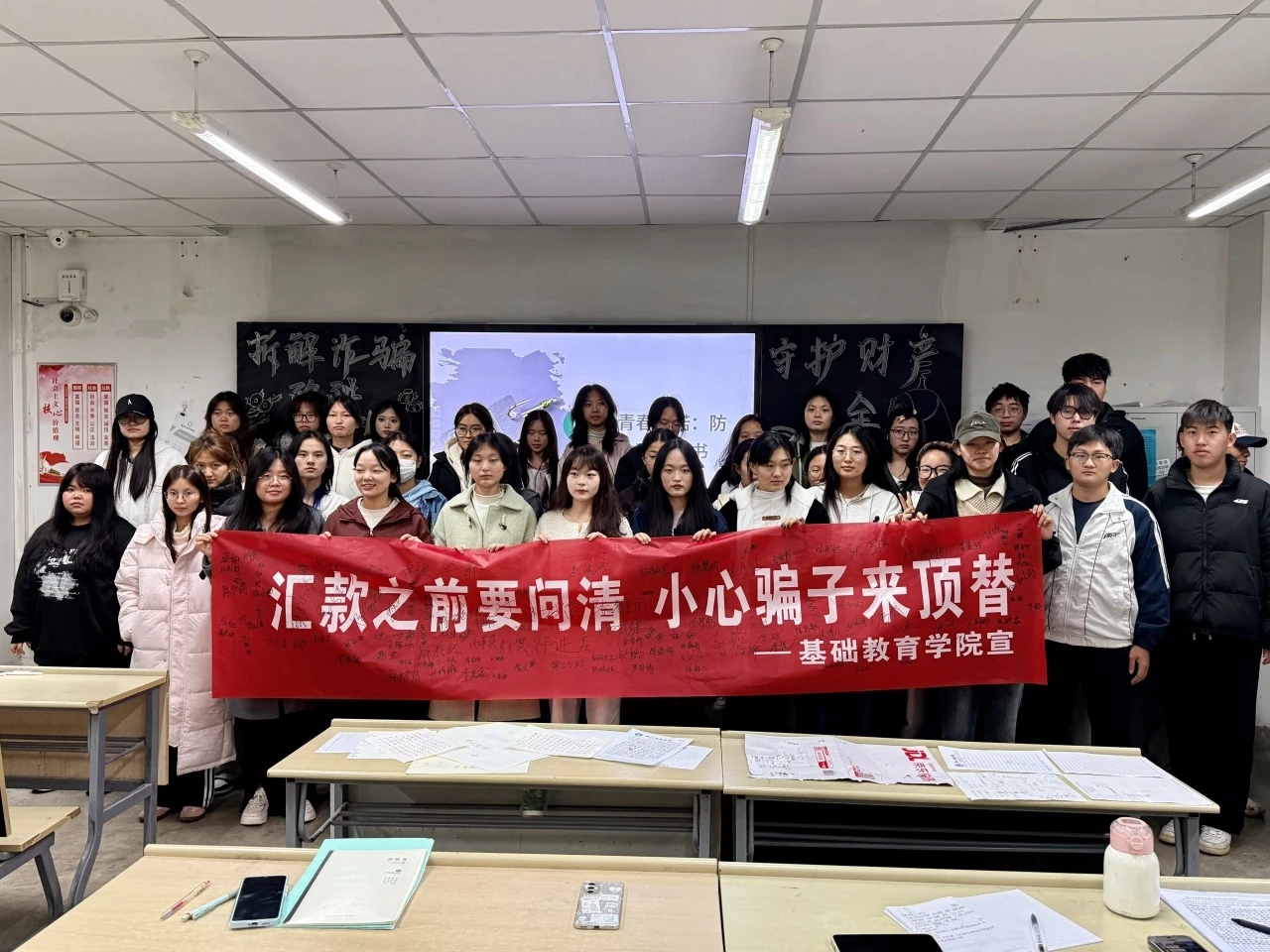 为切实增强学生的防诈骗意识,有效预防和减少诈骗案件的发生,基础教育学院高度重视,迅速行动,通过召开防诈骗专项部署会、各班级开展防诈骗主题班会以及横幅签字倡议等一系列活动,全方位、多层次地开展防诈骗宣传教育工作,为学生们的财产安全保驾护航。