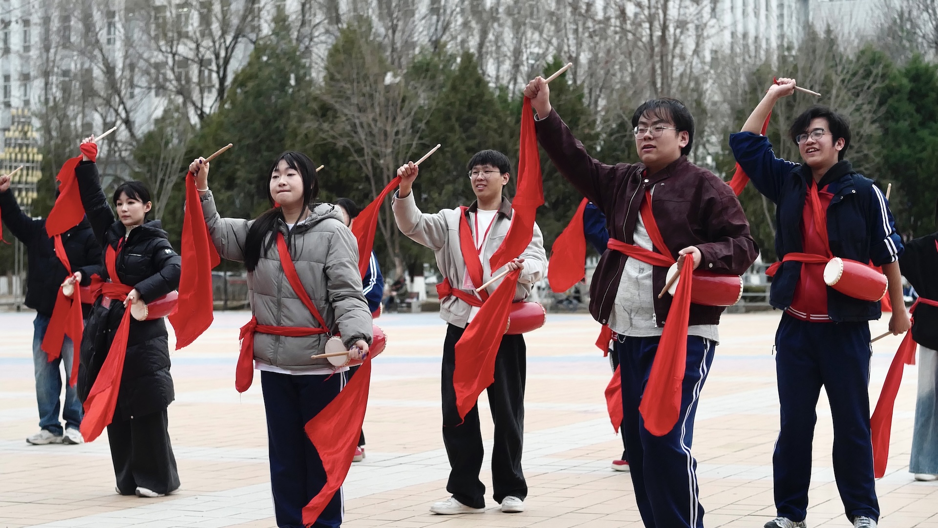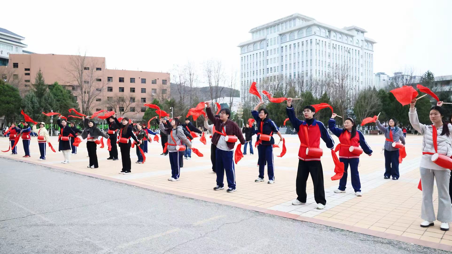 鼓点震天,红绸飞扬,在延安大学窑洞广场上,师生们沉浸式体验了国家级非物质文化遗产——陕北腰鼓。在专业老师的指导下,从基本步伐到节奏韵律,同学们手持红绸鼓槌,腾跃、击鼓,动作整齐划一,气势恢宏。震天的鼓声与飞扬的红绸,不仅展现了黄土文化的磅礴生命力,更激扬出新时代青年的自信与豪情。