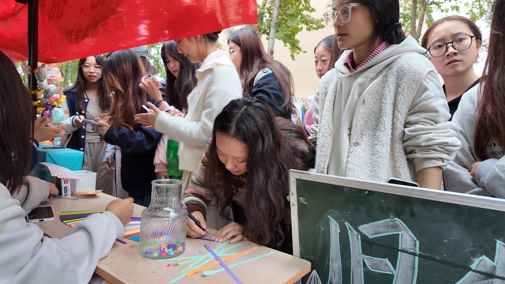 “情绪抱抱瓶”环节则聚焦情感疏导,现场摆放着贴有“开心”“烦恼”“期待”等标签的贴子,内装不同颜色彩纸。学生选择对应情绪的彩纸,写下心事或感受后投入瓶中,再随机抽取一张“加油便签”——“你超棒,别焦虑”“今天的你也在闪闪发光”等暖心话语,让情绪在书写与阅读中得到释放与慰藉。旁边的“投壶小游戏”让氛围更显轻松,学生瞄准投掷,命中即可解锁小奖励;“小星星”环节里,大家将双十祝福写在星星卡片上,装满可爱小瓶子,汇成一片充满心意的“心愿星空”。