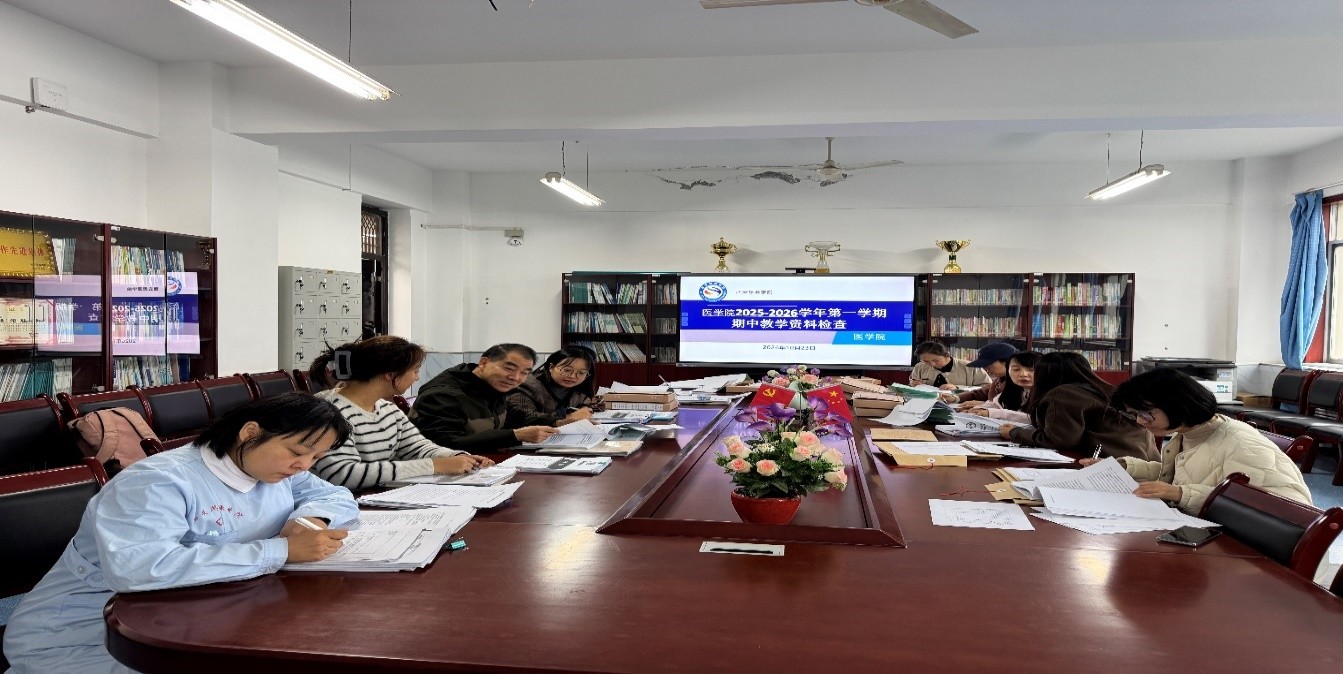2025年10月23日下午15:20-17:00,医学院在中心楼336开展期中教学质量检查工作。此次检查由医学院院长张进生带领,教学副院长李春莉牵头,分院专业负责人、教研室主任及院内督导参与,集中对2024-2025学年第二学期的试卷资料、2025届毕业论文以及本学期任课老师的教学资料进行了抽检。