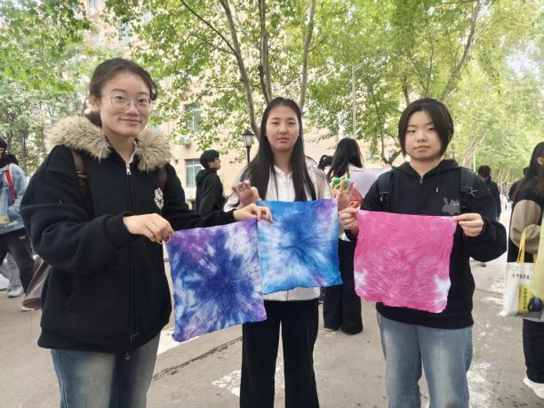 活动现场洋溢着青春活力与创作热情,同学们手持白布与棉绳,全情投入扎染创作:从图案构思到捆扎塑形,从染料调配到浸染把控,每一个环节都激发着大家的探索兴趣。现场欢声笑语此起彼伏,当一件件蓝白交织、各具风格的扎染作品新鲜出炉,同学们的脸上绽放出惊喜与满足的笑容。这些作品在展示区迎风摇曳,宛如一幅幅流动的蓝白画卷,既展现了同学们的创造力,更成为彼此情感交流的无声桥梁。