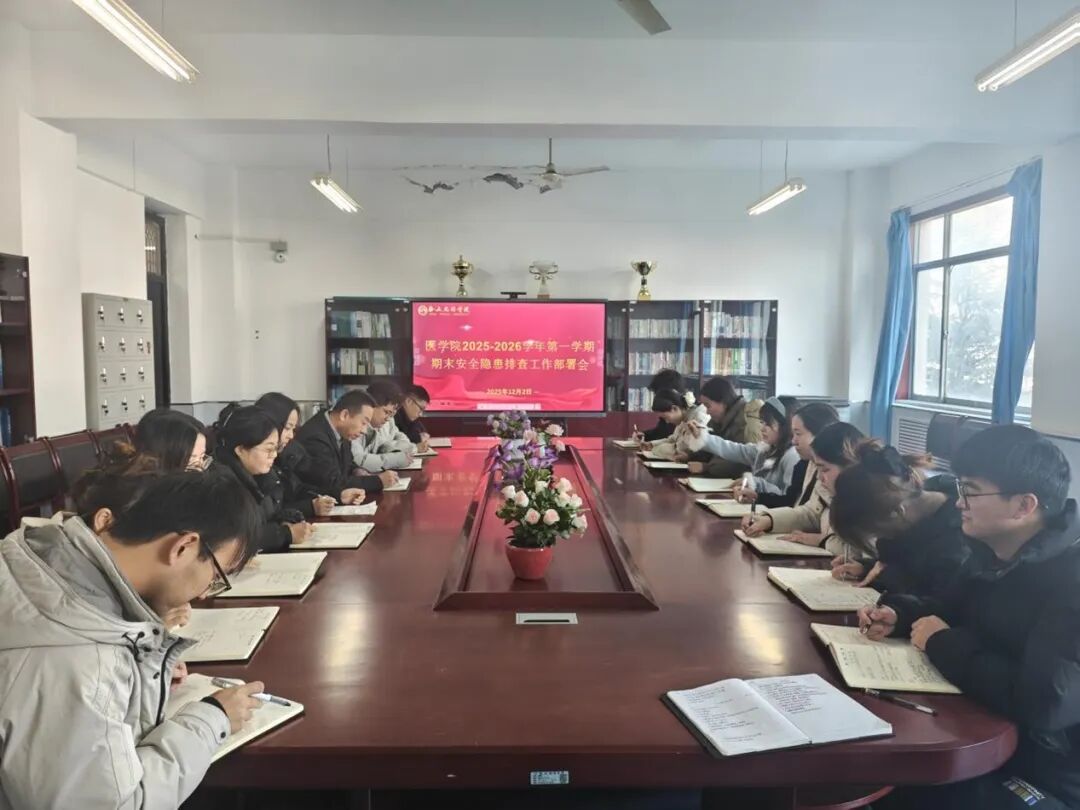 为深入贯彻习近平总书记关于安全生产的重要指示精神,压紧压实校园安全责任,筑牢安全防护屏障,保障期末教育教学秩序平稳有序,营造平安和谐的校园环境,2025年12月2日,医学院召开期末安全隐患排查工作部署会,全体学工干部参会。