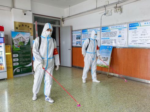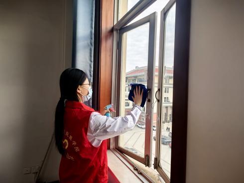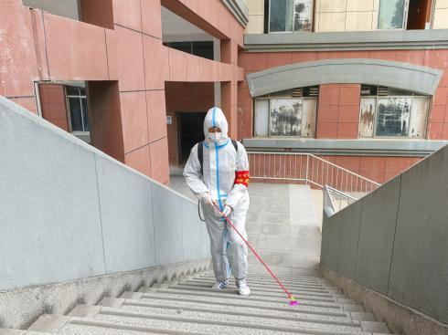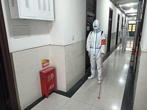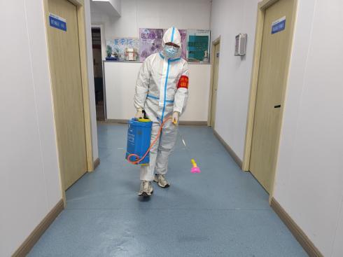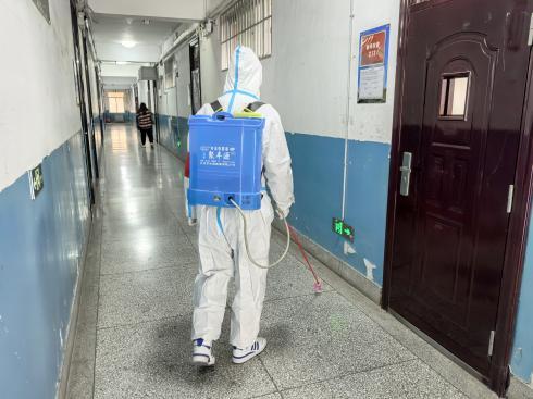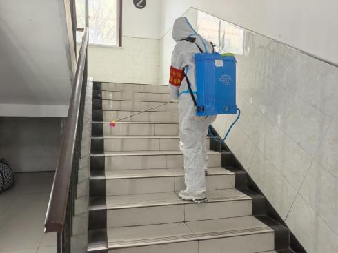 支部成员以延安精神为行动纲领,紧扣“全心全意为人民服务”的核心要义,大力发扬“自力更生、艰苦奋斗”的优良传统,以实际行动为师生筑起一道坚实的安全防线。他们携专业消毒设备深入人员密集区域,对大厅、楼道、教室、宿舍走廊等场所实施全方位、无死角消杀作业。整个过程中,成员们分工明确、默契配合。严格按照消杀规范,配置消毒液,使用喷雾器、消毒抹布等工具,对地面、墙面等大面积区域采用均匀喷洒的方式,对高频接触的门把手、课桌椅、窗台等重点部位进行细致擦拭和喷洒消毒。每一处细节都倾注责任担当,每一个环节都彰显务实作风,以医者仁心的专业素养和脚踏实地的行动自觉,让延安精神在为师生服务的实践中焕发鲜活生命力。