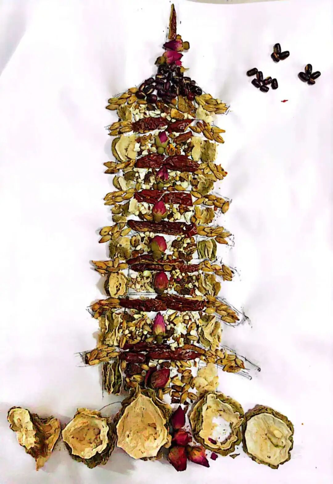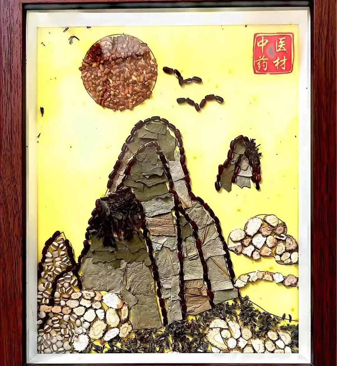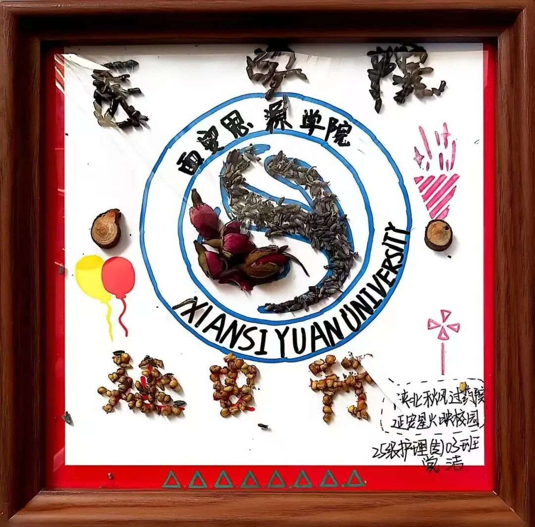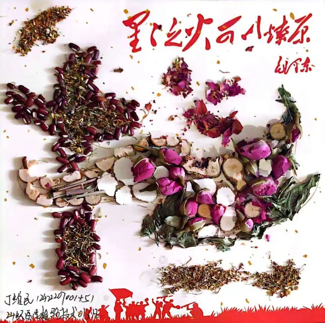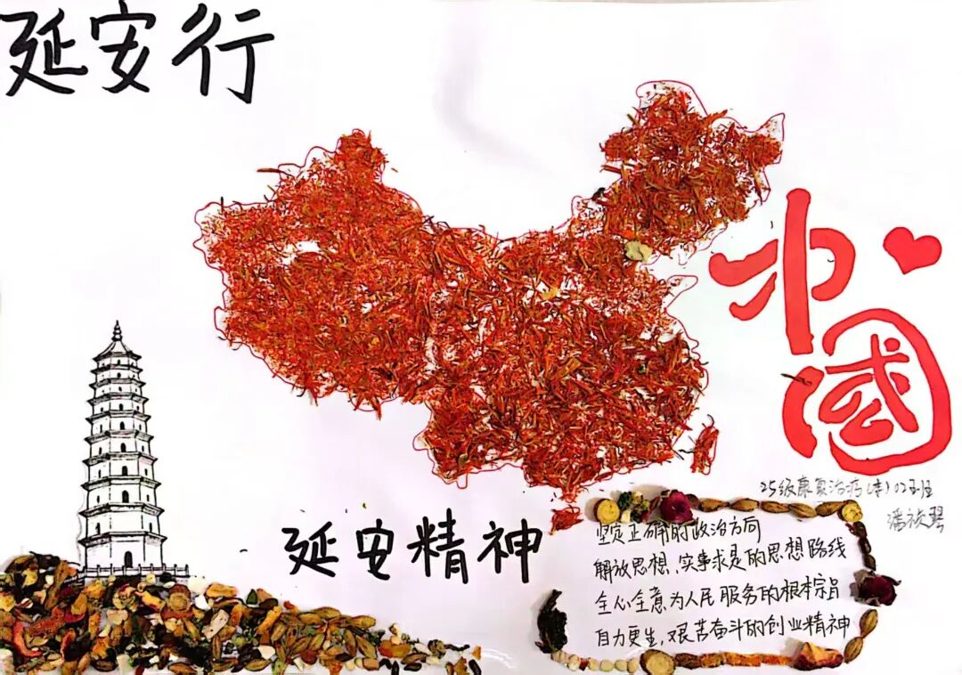在活动过程中,同学们通过制作药材艺术创作作品,主体部分采用真实的中医药材拼贴、镶嵌或拓印构成;创作主题紧紧围绕“山水意境”、“花鸟生灵”、“人体经络”、“经典医方”或“健康生活”等方向自由发挥;将个人创意与中药材进行结合,创作出精美绝伦的作品。其中不少作品聚焦延安研学中的红色记忆,成为活动亮点。同学们以“宝塔山”为创作核心,用深棕的决明子铺就山体,象征革命圣地的厚重底蕴,以鲜红的红花、枸杞勾勒塔身,寓意红色信仰的炽热鲜活,再现了“双手搂定宝塔山”的赤子情怀。每一幅画作既成为传递青春担当的“时代答卷”,也成为传承红色基因的“生动教材”。