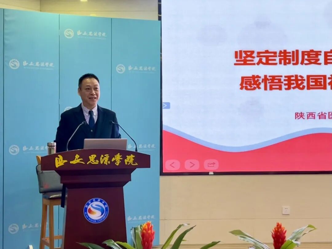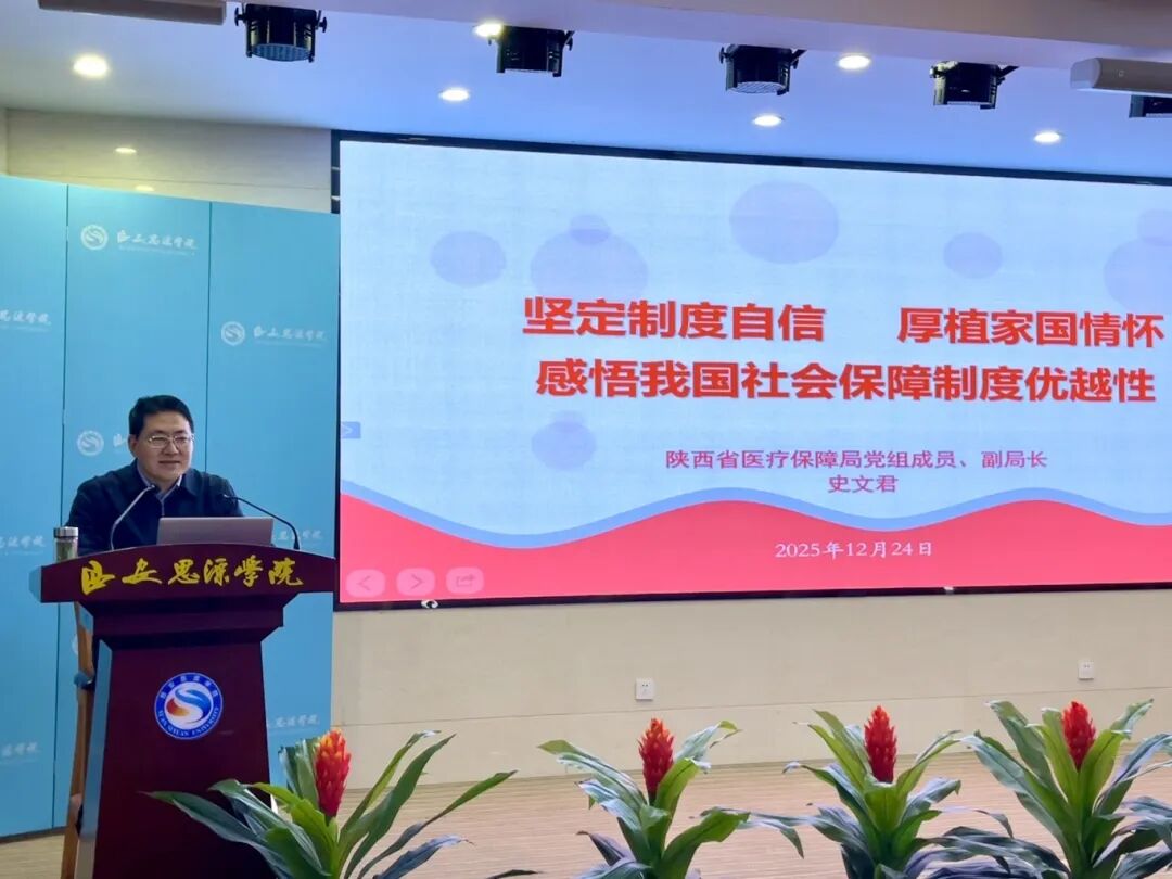 为深入贯彻落实习近平总书记关于学校思政课建设的重要指示精神,学习贯彻党的二十大精神、党的二十届历次全会精神和全国教育大会精神,教育引导学生坚定马克思主义信仰、中国特色社会主义信念,坚定制度自信,厚植家国情怀。2025年12月24日,陕西省医疗保障局联合西安思源学院医学院,在教学报告厅举办以“坚定制度自信 厚植家国情怀——感悟我国社会保障制度优越性”为主题的思政课进校园活动。陕西省医疗保障局党组成员、副局长史文君,陕西省医疗保障局(人事处)三级调研员耿亮,西安思源学院校长助理、医学院院长张进生,西安思源学院党总支书记、学管副院长马晓斌参加活动。活动由西安思源学院党委委员、宣传部部长朱强主持。