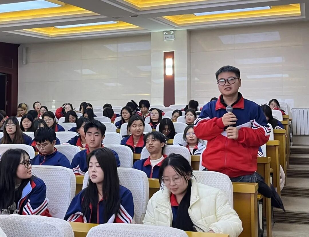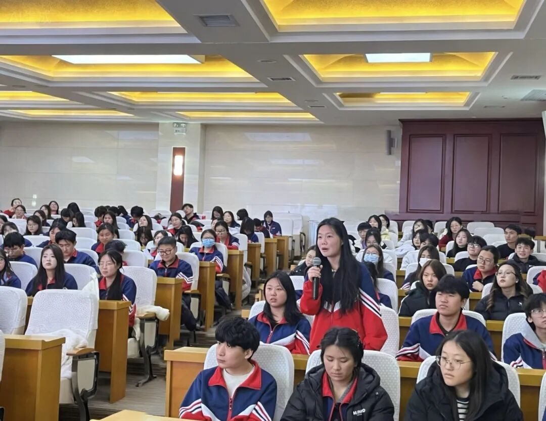 在交流互动环节,2024级护理学(本)03班孟静怡同学、2024级康复治疗学(本)02班归元浩同学作为学生代表就大学生关切的在学校参保与在家乡参保的区别、报销政策有何差异和如何在日常学习中将二十届四中全会精神的学习做到“学、思、践、悟”有机结合走深走实两个问题向史文君副局长提问。史局长结合各省医保报销药品目录的不同为例,就是出现异地就医,在报销时存在参保地的政策,就医地的目录报销情况,可能会造成报销额度的不同,建议大学生尽量在学籍地参加医保,最大限度保障学生权益。在党的二十届四中全会精神学习方面史文君副局长引用习近平主席在2025年新年贺词中“梦虽遥,追则能达;愿虽艰,持则可圆。中国式现代化的新征程上,每一个人都是主角,每一份付出都弥足珍贵,每一束光芒都熠熠生辉。”的金句回应,鼓励青年学子努力学习,提高本领,做理论政策的学习者、创新实践的思考者、未来建设的参与者,勇做时代弄潮儿。