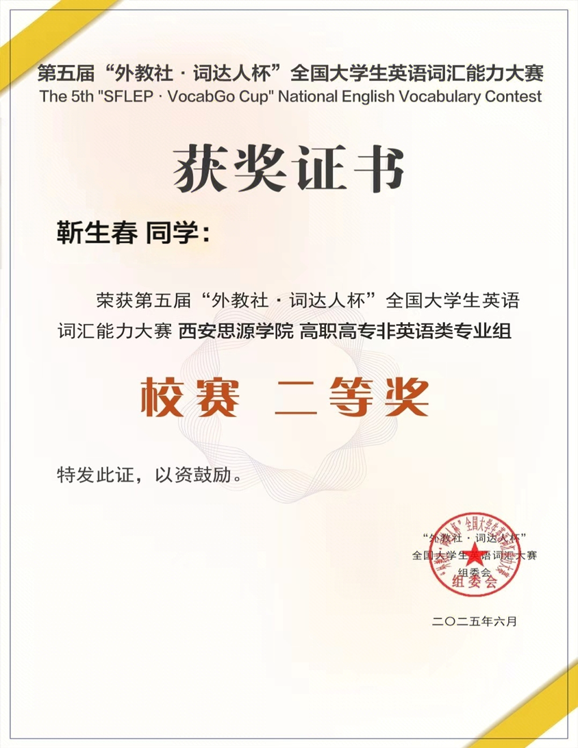 2025年6月 荣获西安思源学院“第五届外教社,词达人杯”校赛二等奖