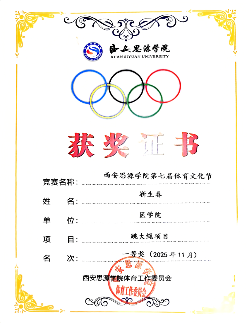 2025年11月 荣获西安思源学院“第七届体育文化节跳大绳项目”一等奖
