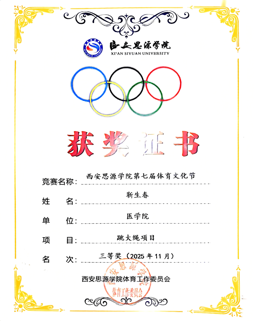 2025年11月 荣获西安思源学院“第七届体育文化节跳大绳项目”三等奖