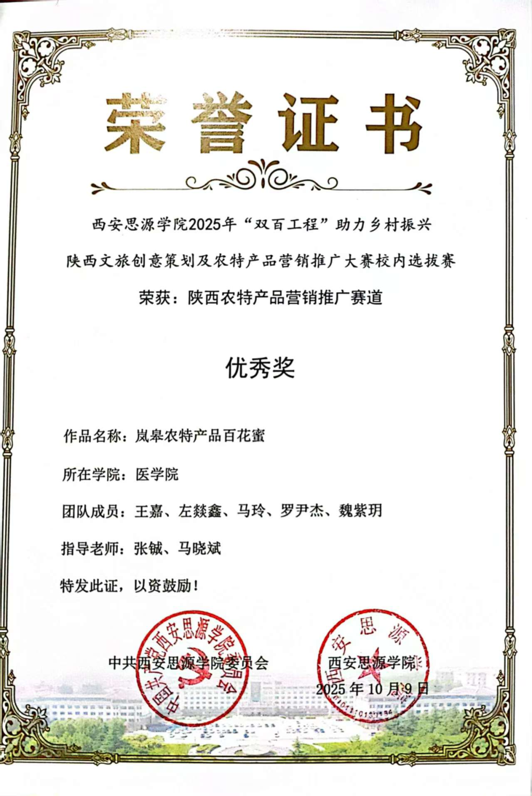 2025年十月荣获西安思源学院“双百工程”助力乡村振兴陕西文旅创意策划及农特产品营销推广大赛校内选拔赛优秀奖