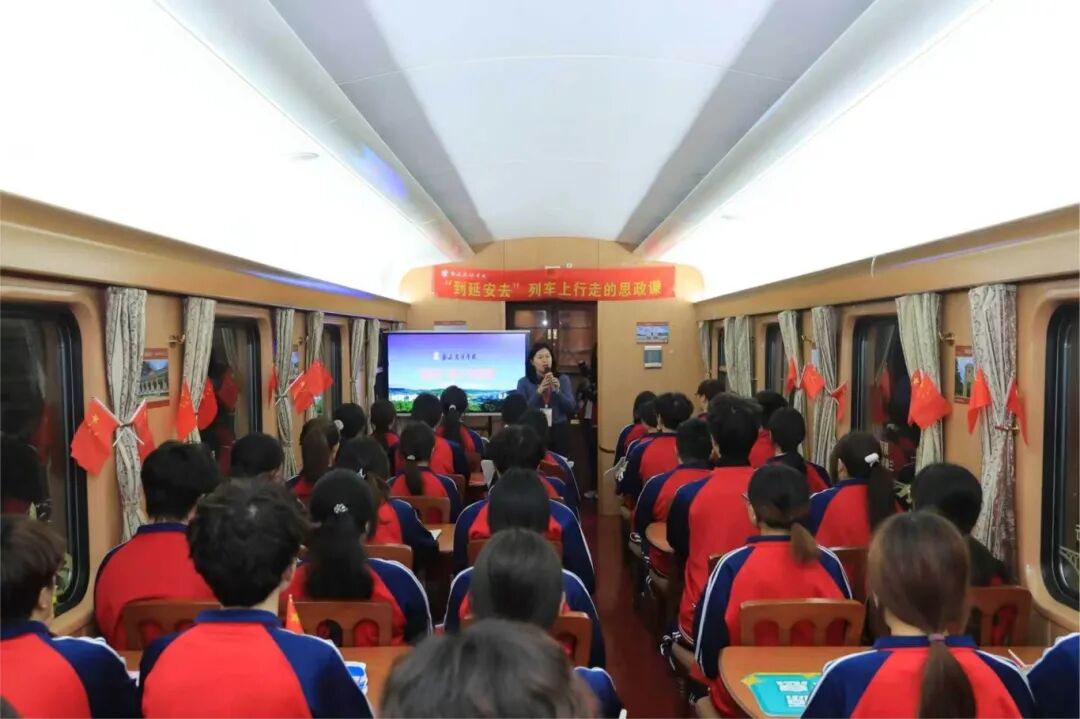 研学途中,关晓老师将车厢打造为“移动思政课堂”,以“延安精神的历史意义和时代价值”为主题,结合历史文献与革命故事,回顾中国共产党在延安十三年的光辉历程。她生动讲述长征会师、大生产运动、延安整风等关键历史进程,用“南泥湾开荒”“窑洞办公”等鲜活案例,引导学生体悟“自力更生、艰苦奋斗”的精神内核。课堂中,师生积极互动、踊跃交流,让书本知识在行程中变得可感可知、可思可悟。