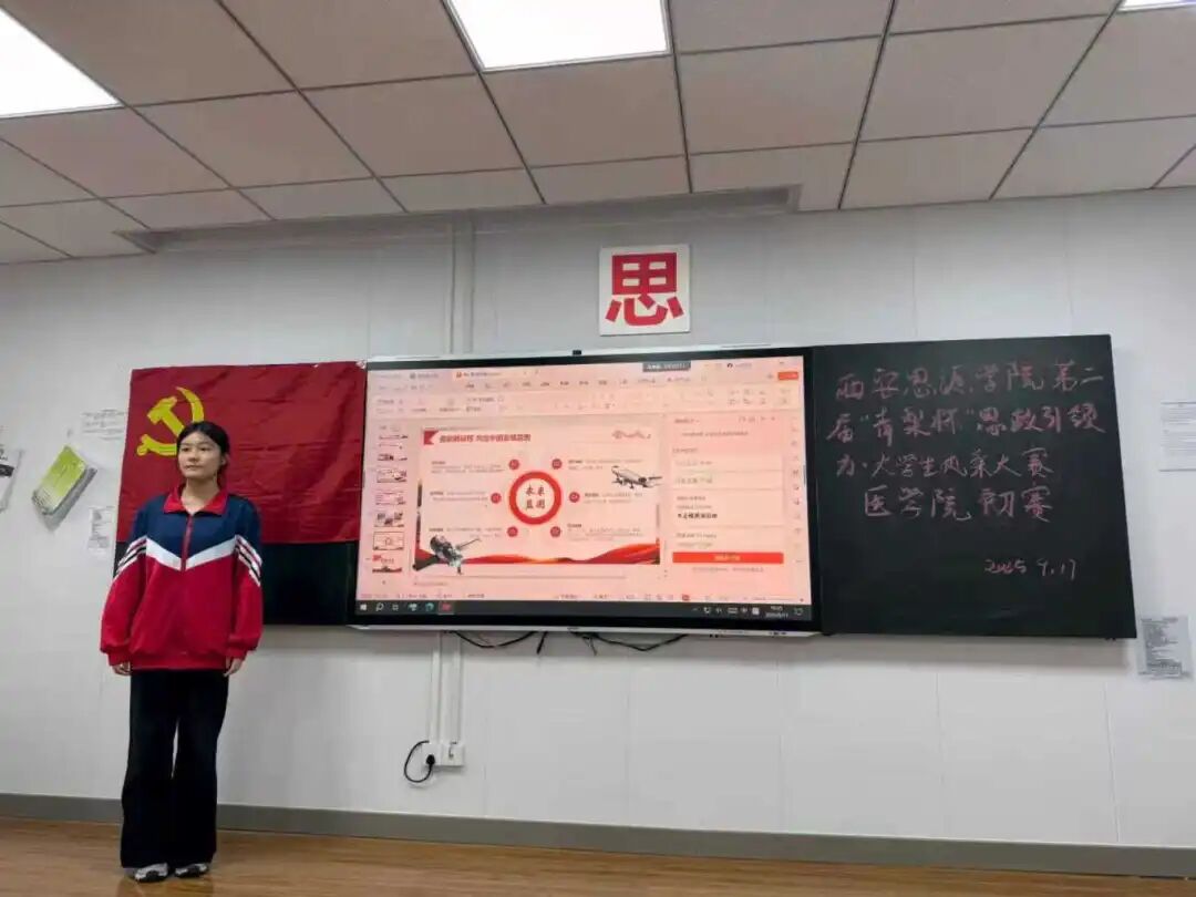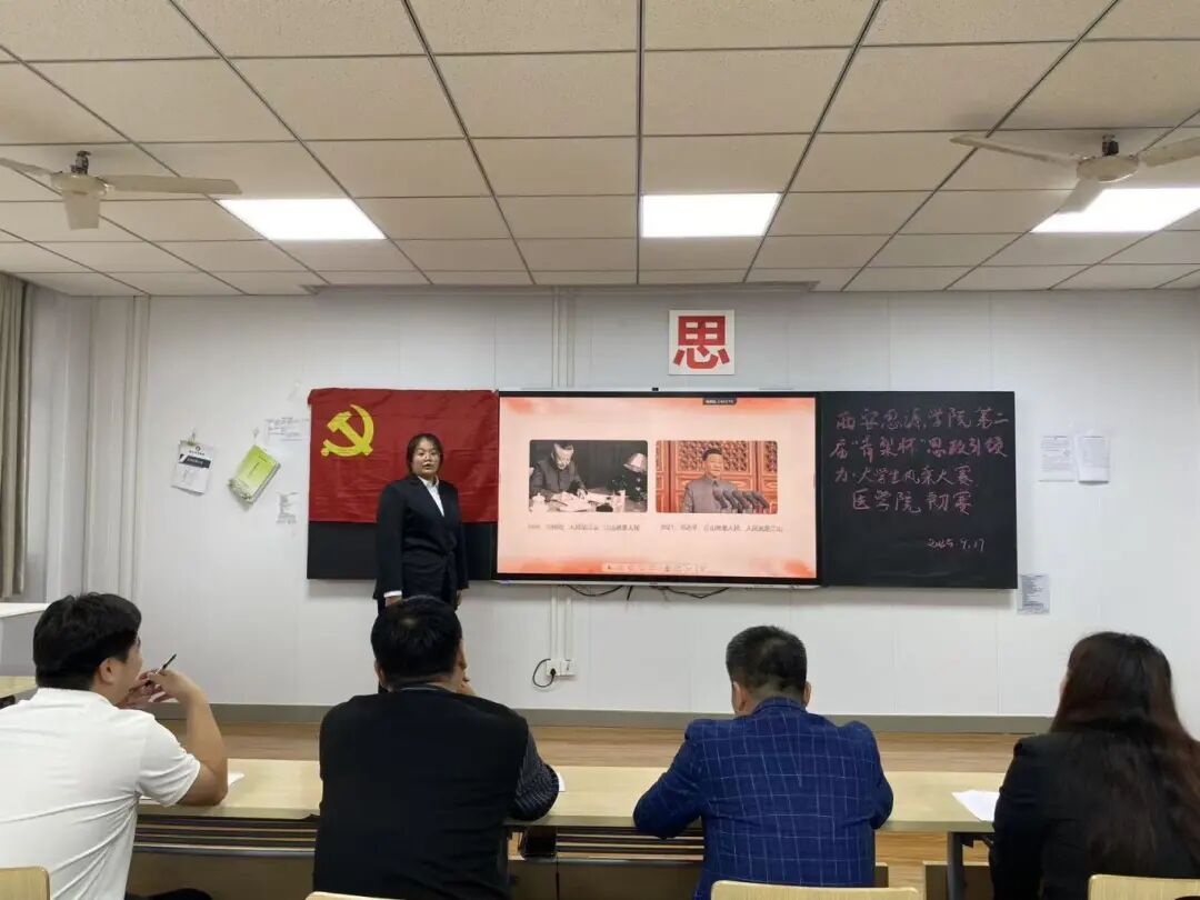 为深入贯彻落实习近平总书记关于“大思政课”建设的重要指示批示精神,彰显高校思政课在塑造人才品格和道德情操方面的核心作用,以习近平新时代中国特色社会主义思想为灵魂,滋养学生的成长与发展。9月17日医学院党总支于中心楼725教室开展西安思源学院第二届“青梨杯”思政引领力·大学生风采大赛医学院初赛活动。马克思主义学院形势政策教研部主任阎立强老师,医学院党总支书记马晓斌同志,医学院党总支组织委员张瑞琪同志,医学院党总支青年委员陈孟珍同志、医学院第三支部组织委员张欣颖同志担任活动评委。
