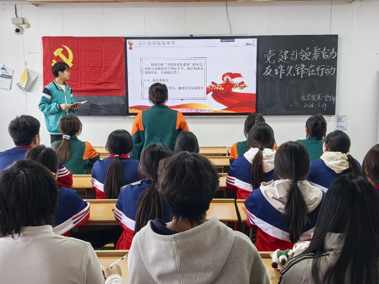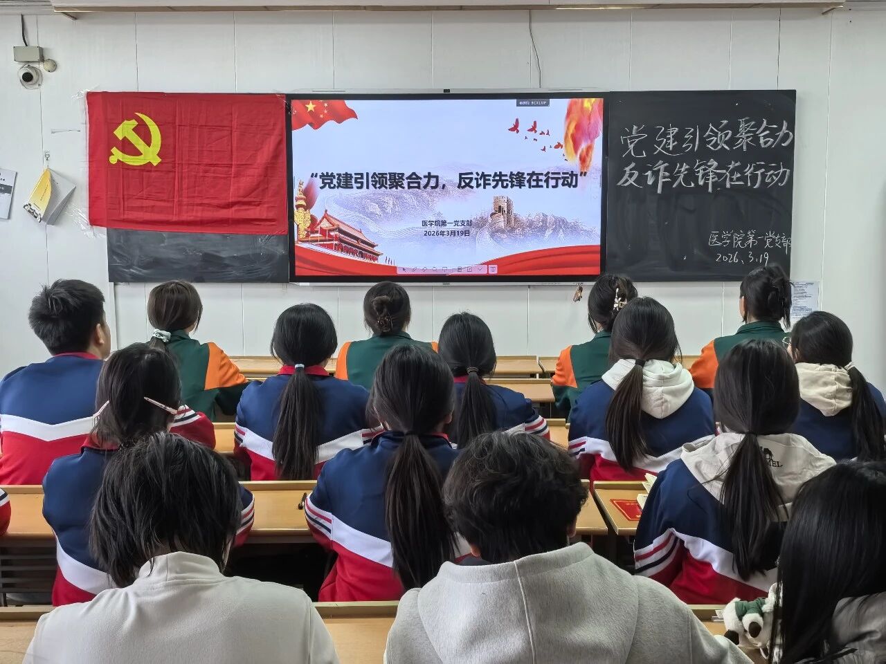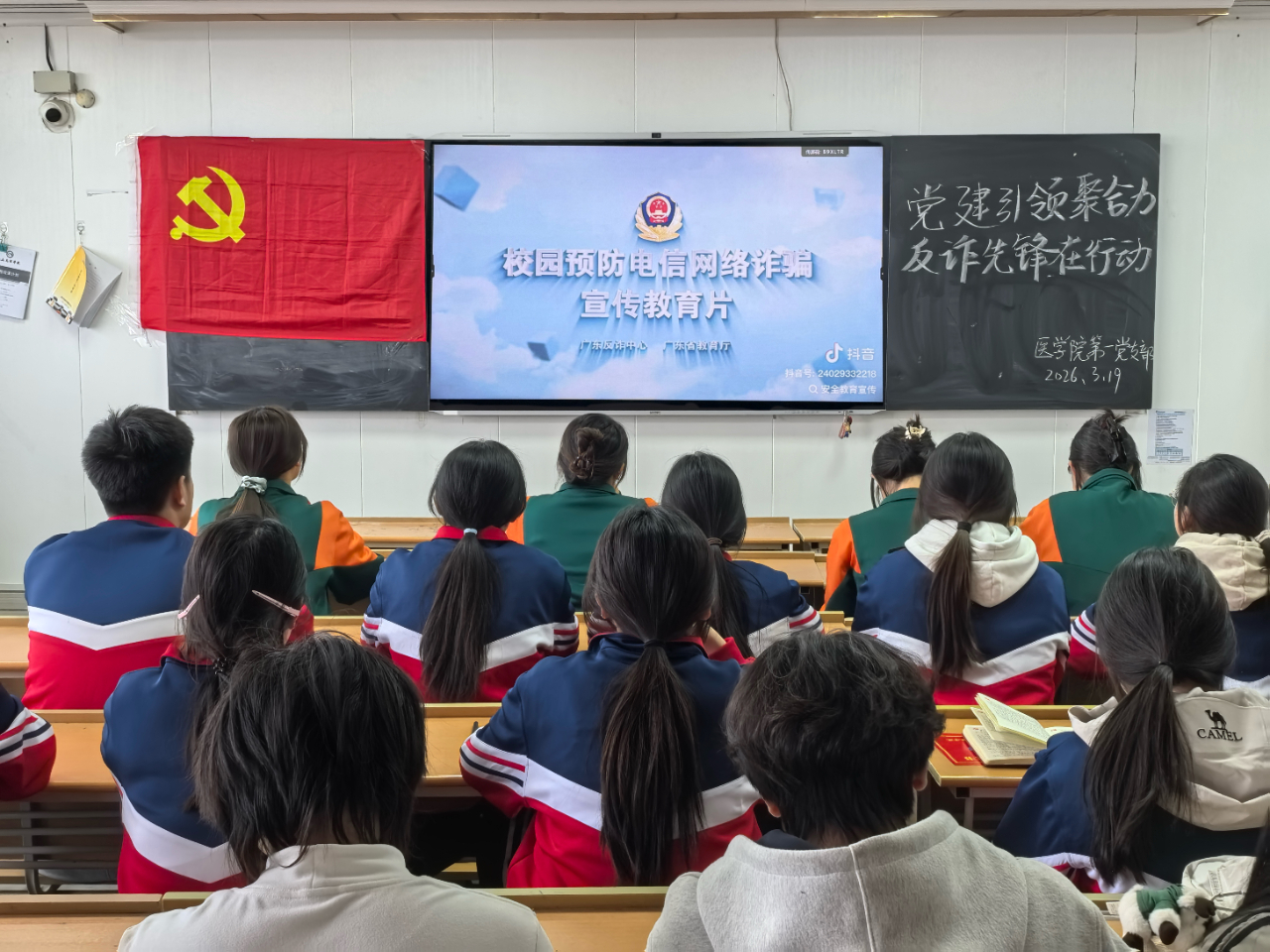 为切实提升广大师生的防诈骗意识与能力,筑牢校园安全防线,充分发挥党支部的战斗堡垒作用和党员的先锋模范作用。2026年3月19日,医学院第一党支部精心组织开展了“党建引领聚合力,反诈先锋在行动”反诈宣传活动。活动通过观看反诈宣传视频、举办反诈知识抢答、进行反诈动员宣誓三个环节,引导全体党员争做反诈防骗的宣传者、践行者和守护者。医学院第一党支部全体成员参与活动。