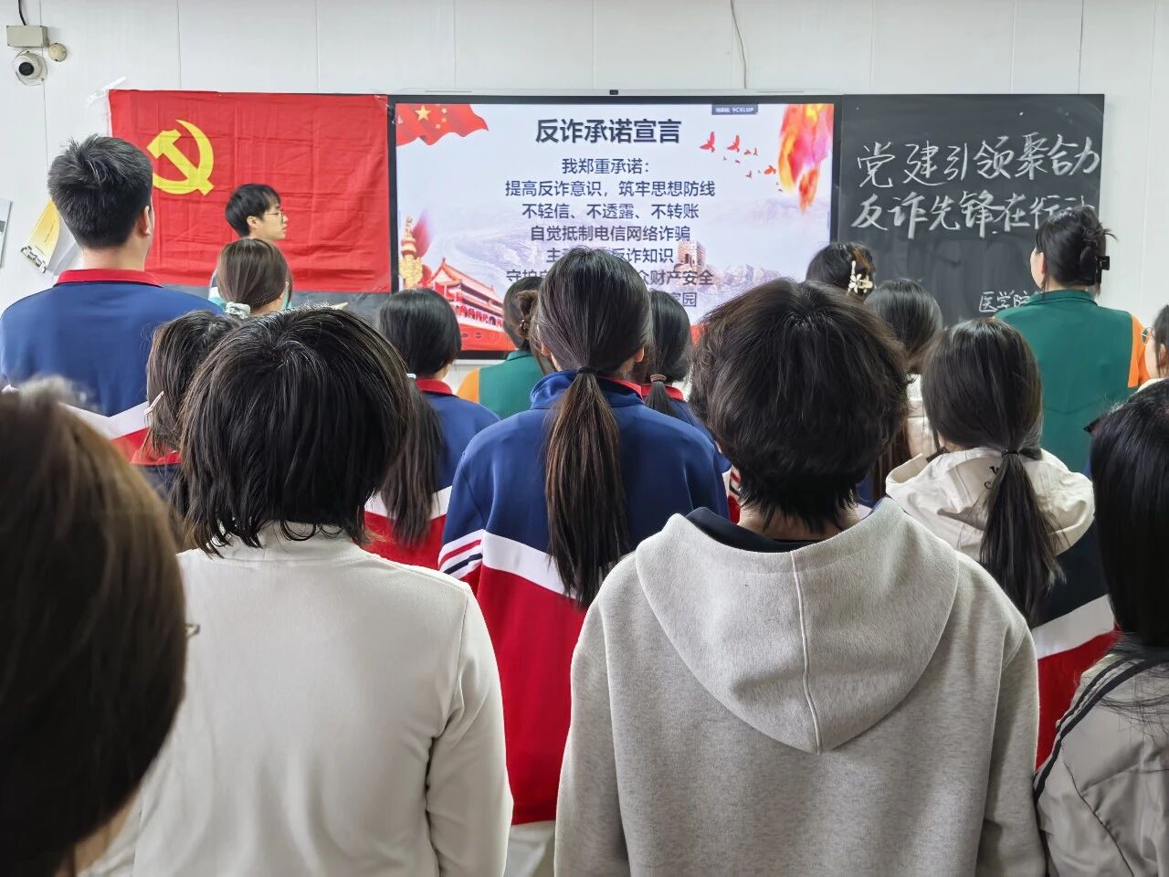 活动最后,支部全体成员面对 鲜红的党旗,举行了庄严的反诈动员宣誓仪式。“我宣誓:我将发挥党员先锋模范作用,带头学习反诈知识,带头宣传防骗技巧,带头抵制诈骗信息,不轻信、不透露、不转账,勇于同一切诈骗违法犯罪行为作斗争,为守护师生财产安全、构建平安和谐校园贡献党员力量!”一句句铿锵有力的誓言,表达了支部党员投身反诈斗争的坚定决心和责任担当。大家一致承诺,要将反诈行动融入日常学习、工作和生活,从自身做起,辐射带动身边同学、群众,共同织密校园反诈“防护网”。