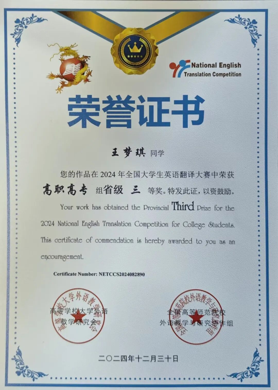 2024年获全国大学生英语翻译大赛中荣获“高职高专组省赛三等奖”