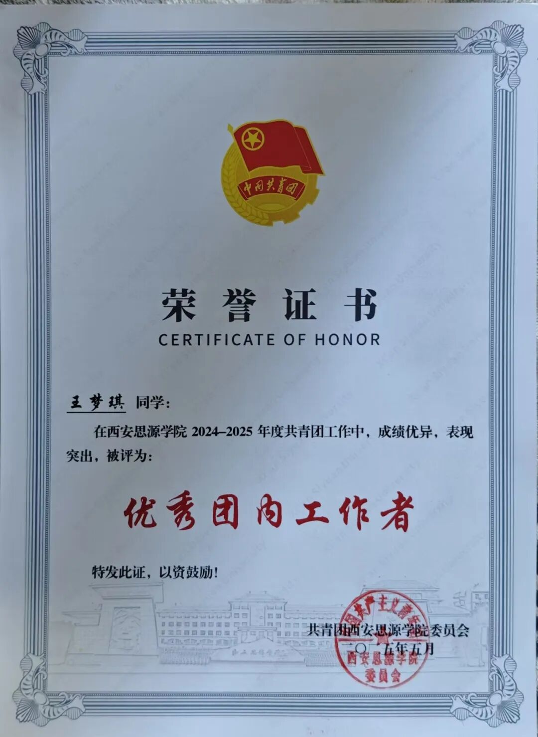 在西安思源学院 2024-2025年度共青团工作中,成绩优异,表现突出,被评为“优秀团内工作者”