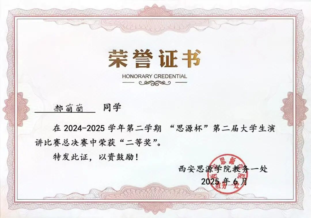2025年6月获得“思源杯”第二届大学生演讲比赛二等奖