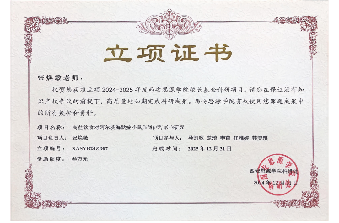 2024年12月参与 2024-2025 年度西安思源学院校长基金科研项目