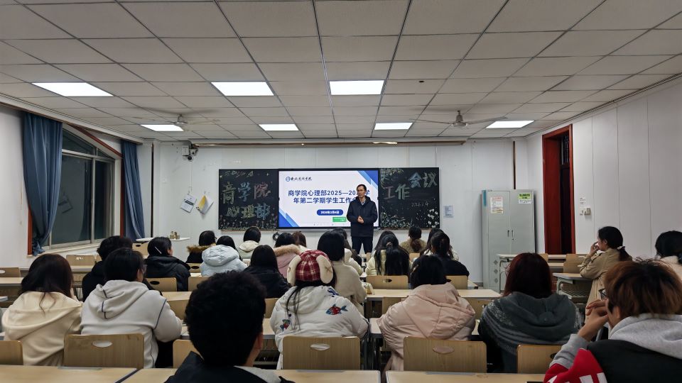 为系统总结上学期工作成效、精准部署近期活动安排、清晰明确心理部工作方向与核心要求,2026年3月4日20时40分,商学院心理部本学期第一次工作会议在西楼209教室召开。商学院党委书记、学管副院长黄洪松老师、李思雨老师、宋静文老师以及心理部全体成员参与此次会议。