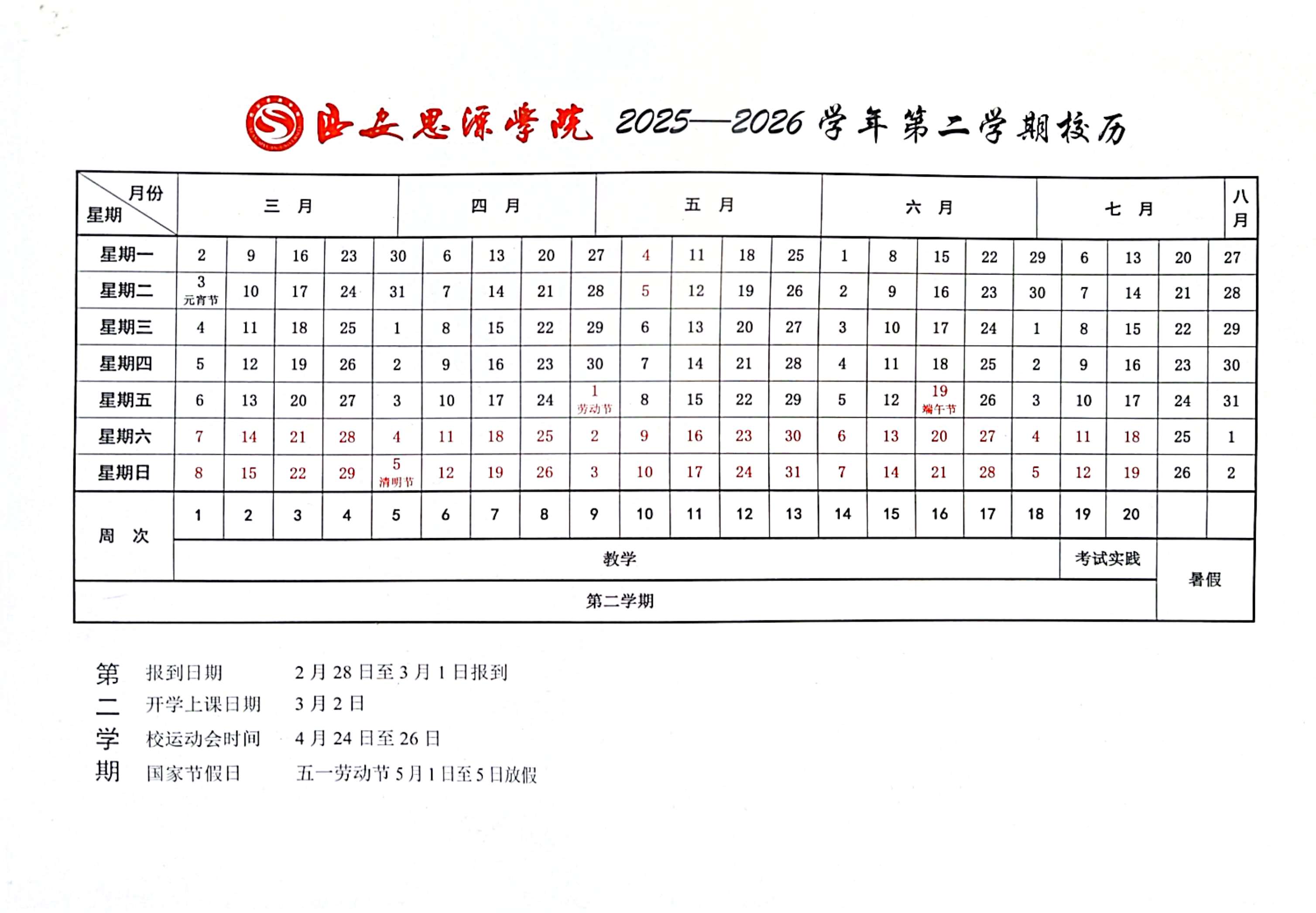 2025-2026学年第二学期校历