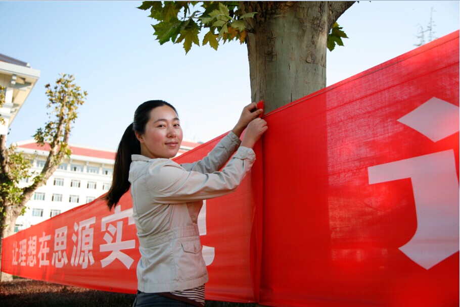 近些天在校园里,我们经常可以看到这样一幅景象:一位女老师,手拿钳子铁丝,往返于校内各处,悬挂维护着校园内多达70条横幅标语。为了营造迎评氛围,学校决定在校内各处悬挂横幅标语,新闻宣传中心将这副重担就交给了身材颀长但略显单薄的王妮老师身上。接到任务后,她一点抱怨都没有。从开始的选择悬挂位置,到一条条的标语订做,再到后来一条条的悬挂,期间遇到许多困难,但她都迎难而上,认真负责并出色地完成了任务。为了保护校园环境,不损坏花草树木,她每次在挂横幅的时候,都先将花草小心的用铁丝围护起来,然后再工作;风雨交加时,都会看到她漫步在校园的每个角落,悉心的维护着每条条幅,生怕它们受到一丝丝伤害。她每天在楼宇间爬高上低、在校园里到处巡查修补,大家都说:“王妮老师真是个手艺人。”