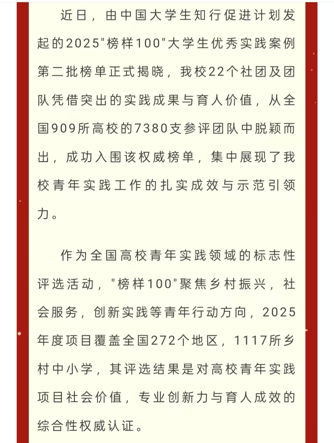喜报!我校22个社团及团队荣登2025"榜样100"大学生优秀实践案例第二批榜单
