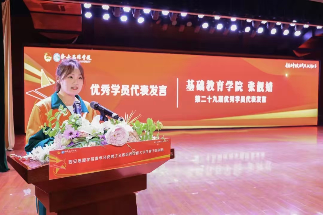 第二十九期青马班优秀学员代表张靓婧结合培训经历分享收获与感悟。她表示:青马学习让自己筑牢信仰根基、明晰责任担当,未来将以结业为新起点,把青马精神转化为服务同学、奉献校园、投身时代的实际行动。