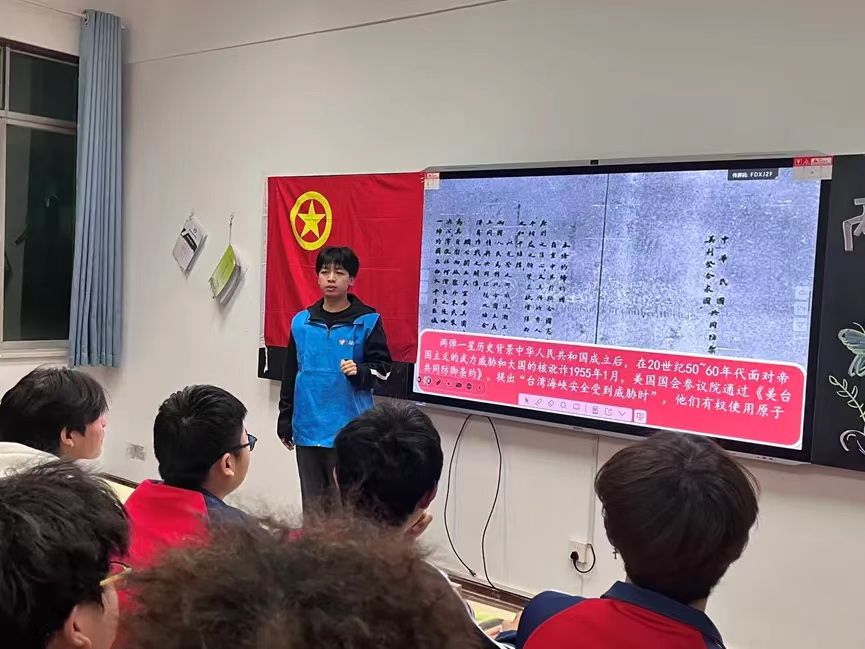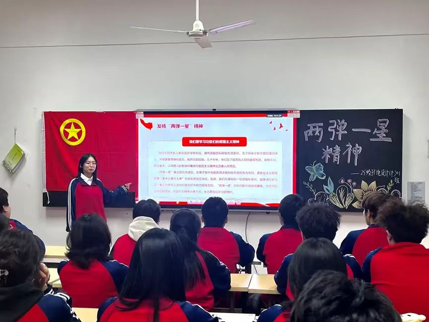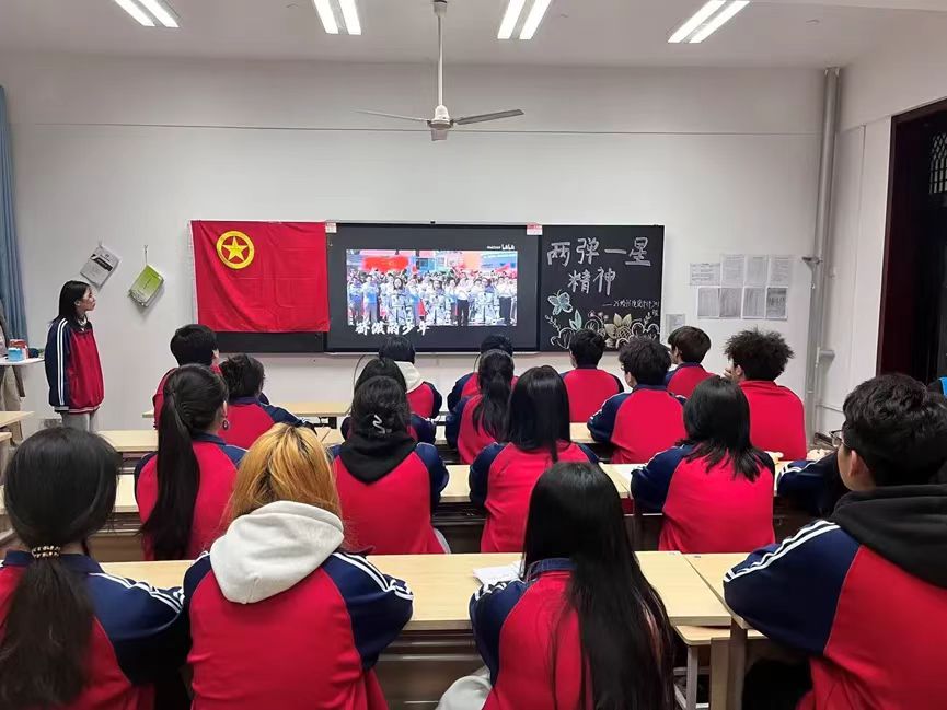 随后,环境设计专业2025级01班团支部书记刑雅赟同学发言。她围绕“两弹一星”工程的历史意义展开讲解,生动阐述了20世纪中叶,我国在国家经济、技术基础薄弱和工作条件十分艰苦的情况下,依靠自力更生、艰苦奋斗,成功研制出原子弹、氢弹和人造地球卫星的伟大壮举。她还分享了科研人员在戈壁荒漠中,用算盘计算核数据、以土坯房为实验室的感人故事,让同学们深刻体会到“两弹一星”工程背后的艰辛与不易,以及科研工作者们为国奉献的坚定信念。