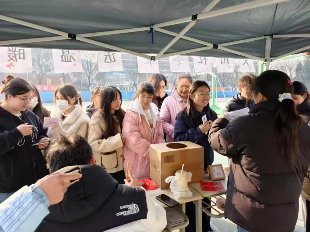活动正式开始后,篮球场迅速成为一方文化交融的天地。互动答题区气氛热烈,同学们踊跃参与——从杜甫《冬至》的诗句接龙,到与笔墨相关的成语竞猜,从“数九”习俗到书法常识,大家在趣味问答中增进了对传统文化的理解。通关后,既可领取文创纪念品,也可在体验区提笔书写冬至诗句,感受笔墨之间的流转与雅致。现场更有同学主动分享家乡风俗,北方饺子、南方汤圆,在言谈中实现了南北风情的温暖交汇。摄影师穿梭其间,定格师生互动、同窗携手的生动画面,留存一段段笔墨传情的校园记忆。