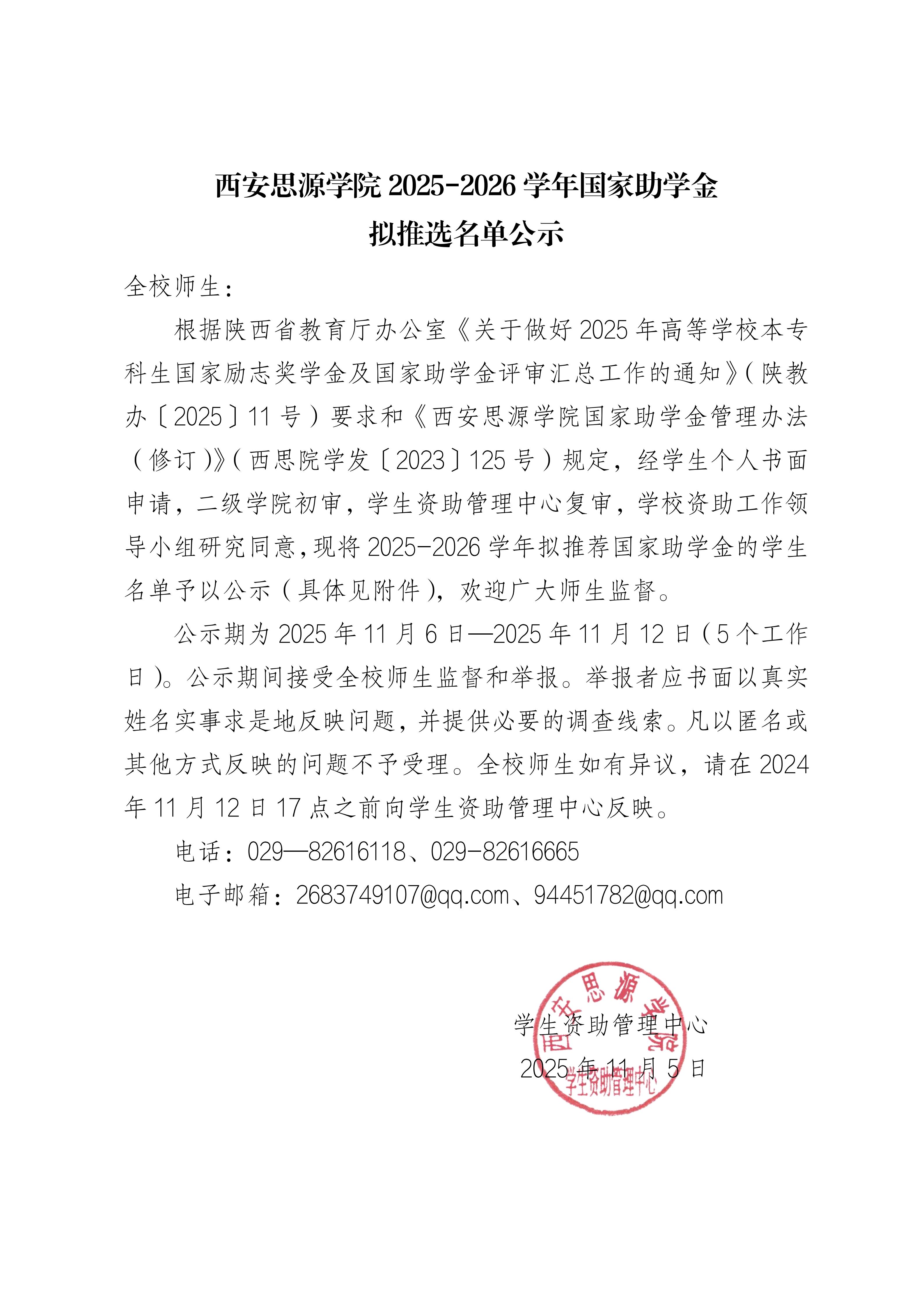 西安思源学院 2025-2026 学年国家助学金拟推选名单公示