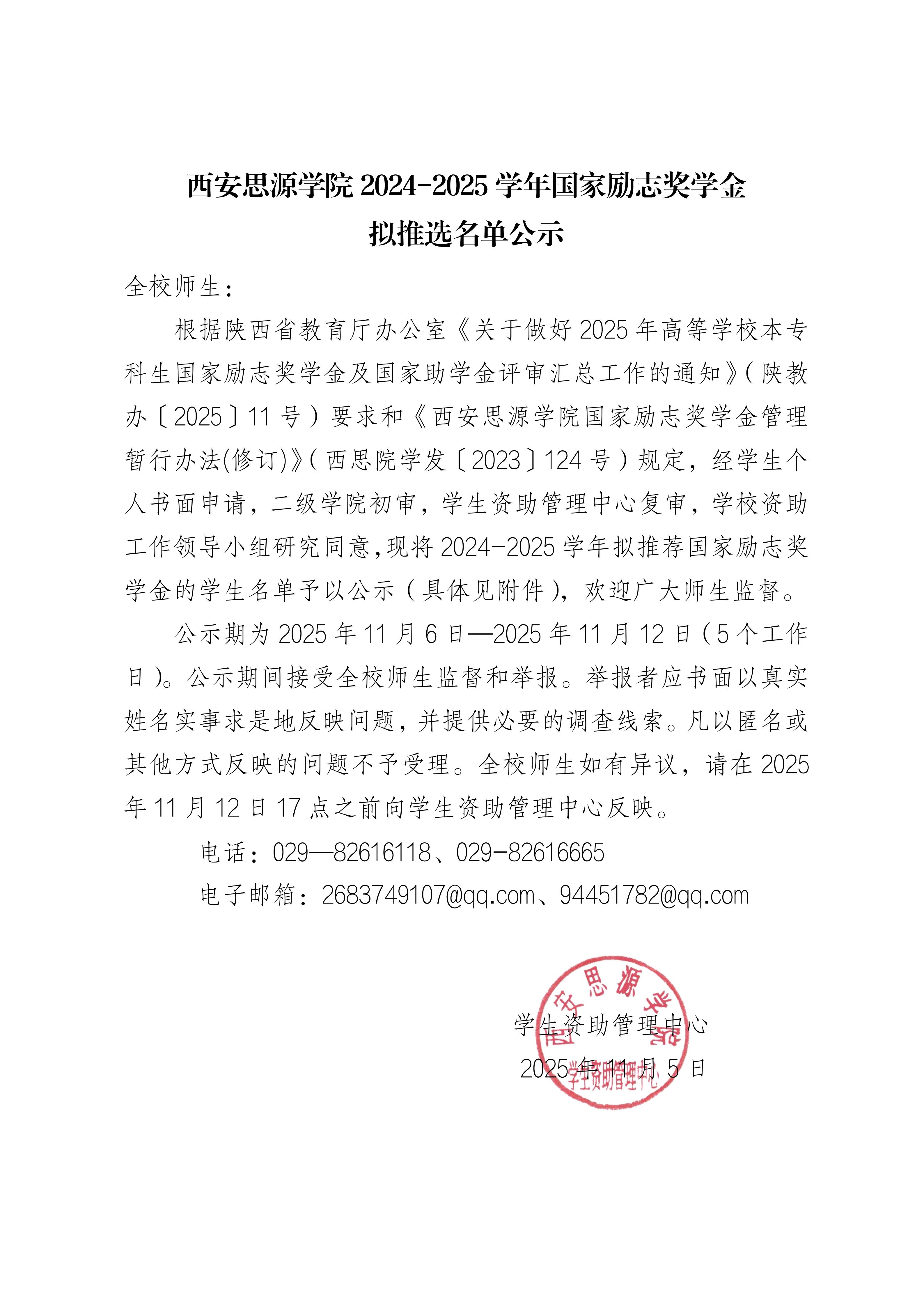 西安思源学院2024-2025学年国家励志奖学金拟推选名单公示
