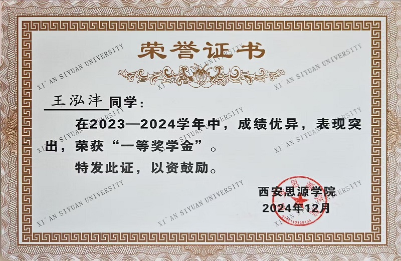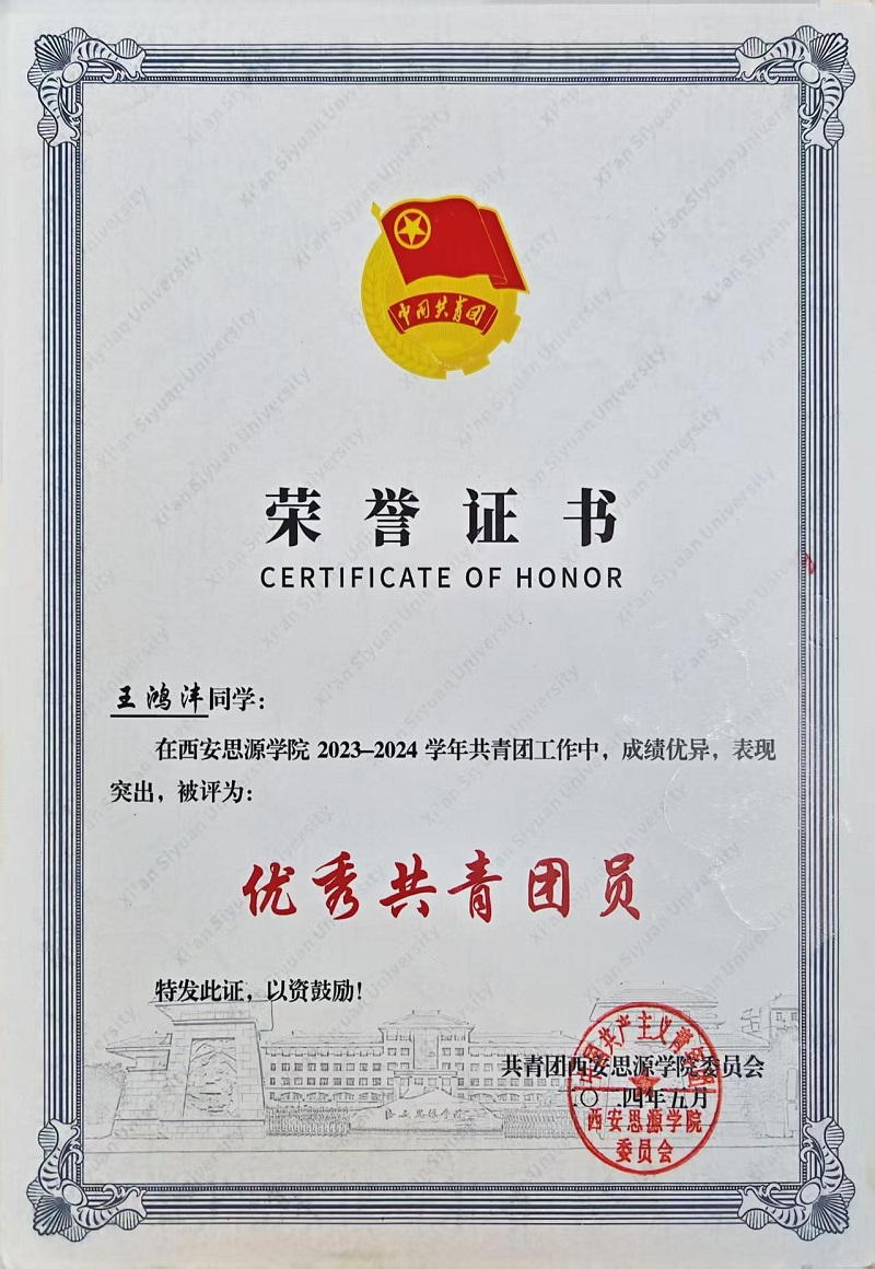 在学生工作中,王泓沣同样履职尽责、成果显著。任职班级班长时,他督促班级同学认真完成学校安排的每一项任务,在班级的班风建设、学风建设、党团思想建设方面取得显著成效;作为学院辅导员助理,他积极发挥模范带头作用,协助辅导员开展学生日常管理、奖励资助等各个方面的学生工作,关注大家的思想动态、深入了解大家的学习生活情况、认真细致做好学生材料的整理,积极承担师生之间的桥梁作用。担任学院督导部部长期间,他参与策划组织多项学院活动,从方案构思到落地执行,锻炼了组织协调能力,更培养了严谨细致的工作作风。其出色的工作表现,赢得了师生的一致认可,连续荣获西安思源学院2023-2024学年“优秀共青团员”、西安思源学院2024-2025年度“优秀团内工作者”等荣誉称号,这是对他辛勤付出的最好肯定。